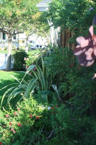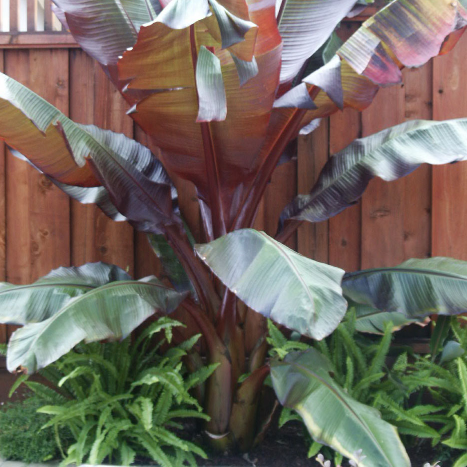 Tropical plantings integrate with low-water Mediterranean plants to create an unusually lush and beautiful setting
